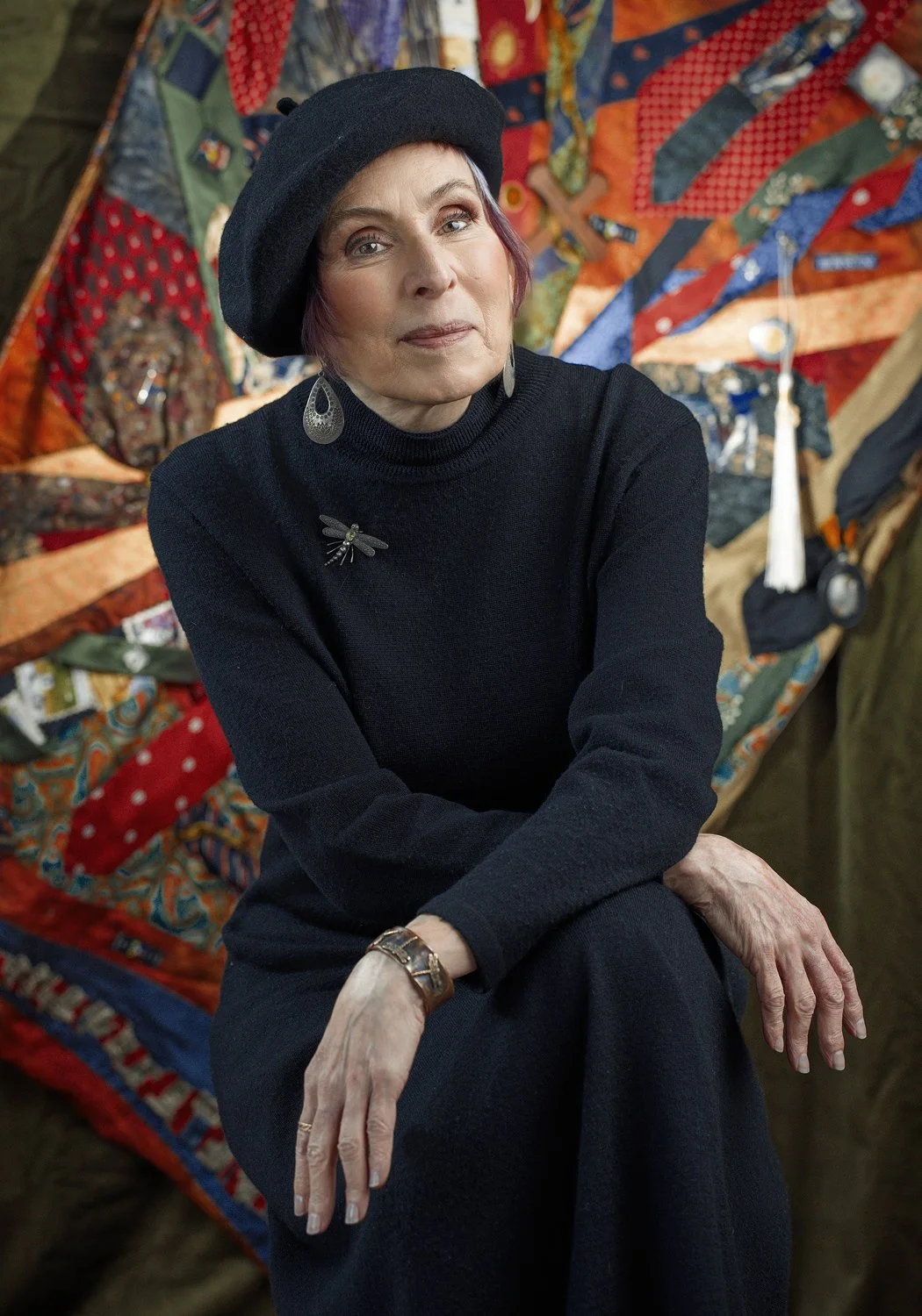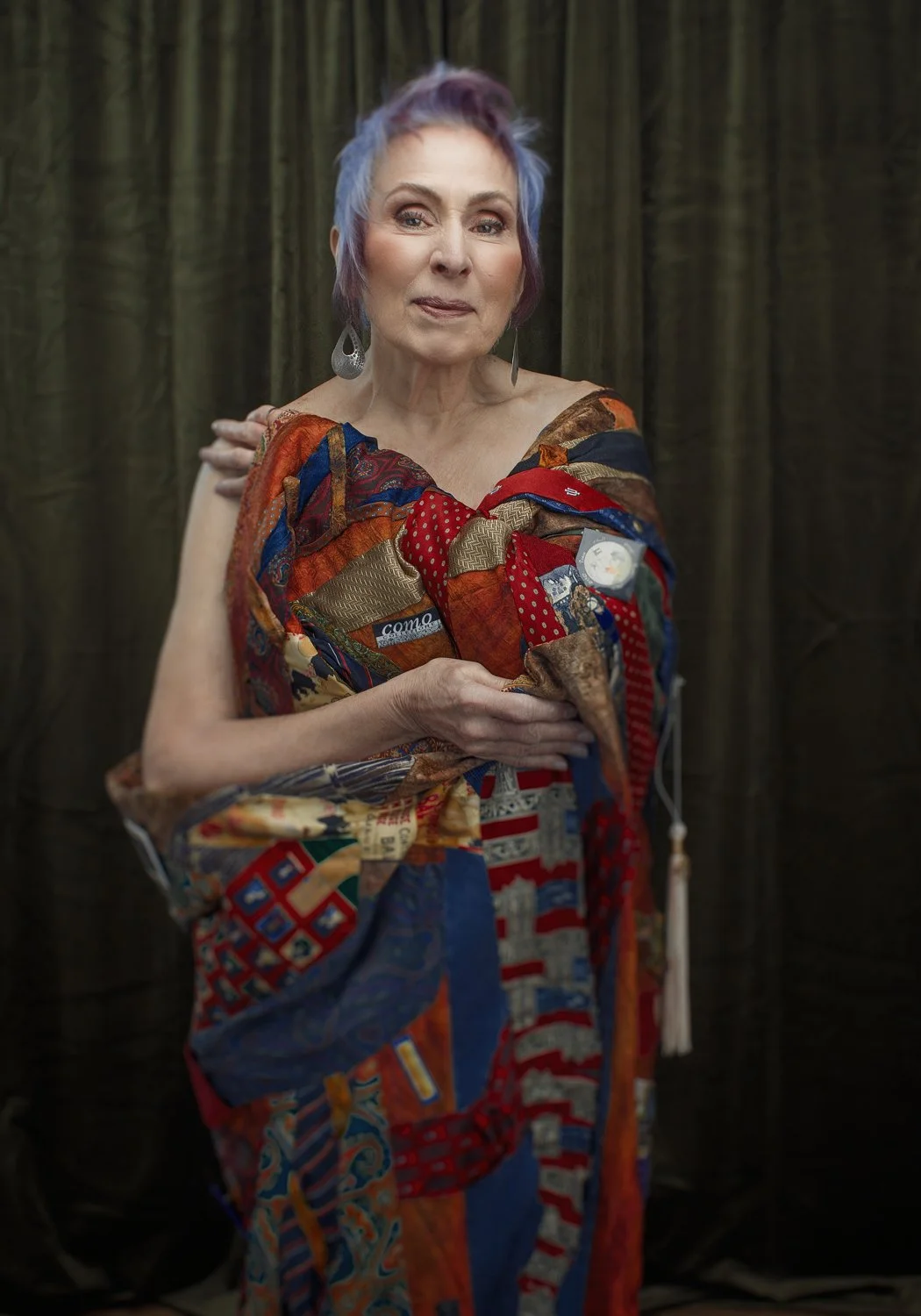 Part of Bern’s photoshoot wardrobe was the handcrafted wall hanging she created out of her late husband’s neckties. Each of the ties holds a memory and is a beautiful, colorful representation of his abundant, positive energy. In some of the photographs, it serves as a background—the support standing behind her. And in other photographs it envelopes her. As I was photographing her wrapped up in his ties, her eyes lightly closed and peace settled across her face. I asked her how she felt in that moment. “Like I’m in the midst of a warm hug,” she responded.